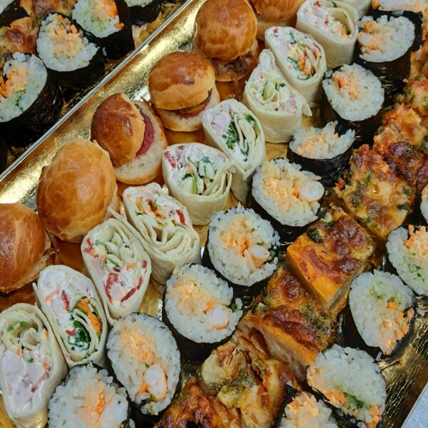 des pics, des serviettes, des plateaux carton argentés placés dans des boîtes pâtissières.